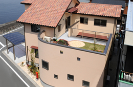 Shape : 落ちついた洋風の外観は、あわい色合いが品よくまとまり、やわらかで心地よい南欧の風が今にも吹いてきそうです。中に入ると木の香りにあふれ、住み人の思いがこもった間取りは縦長の敷地を忘れてしまう程、光に溢れています。 |