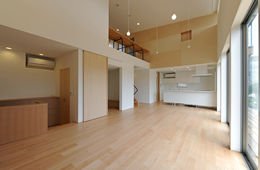 Shape : 高くそびえる片流れの屋根に黒くシャープな佇まいの外観とはうって変って、家の中は穏やかな風と木の香りの漂う安らぎの空間となっています。高い吹抜けからは光が燦々と入り、隣接して家が建っていても十分明るく風通し良く出来ることの証明となります。 |